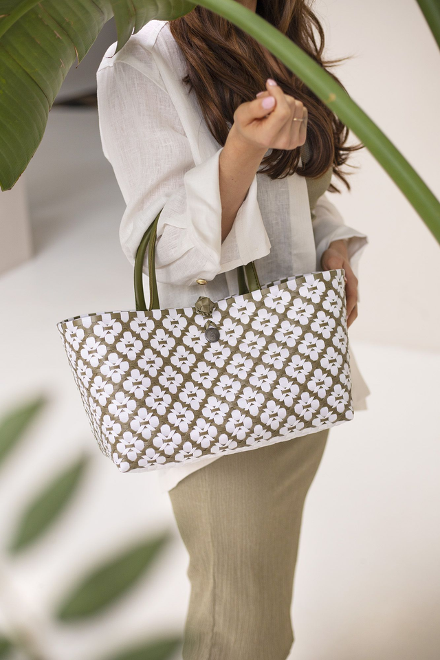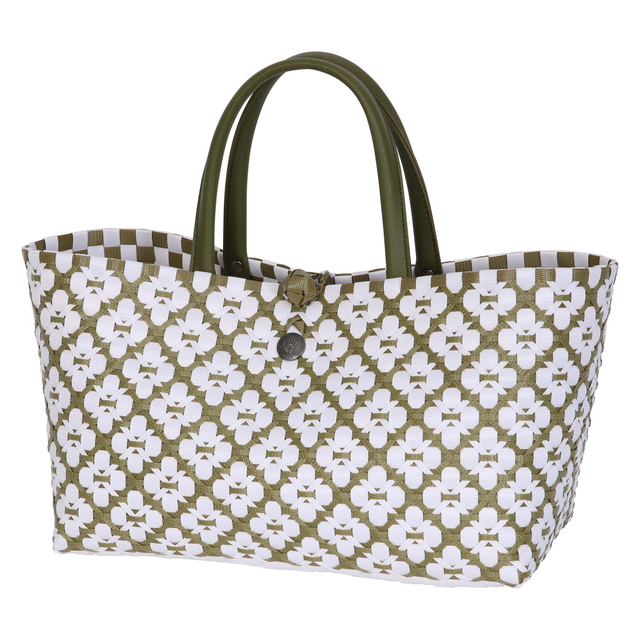 Handtasche oliv mit weißem Muster Größe S mit kurzen PU-Griffen